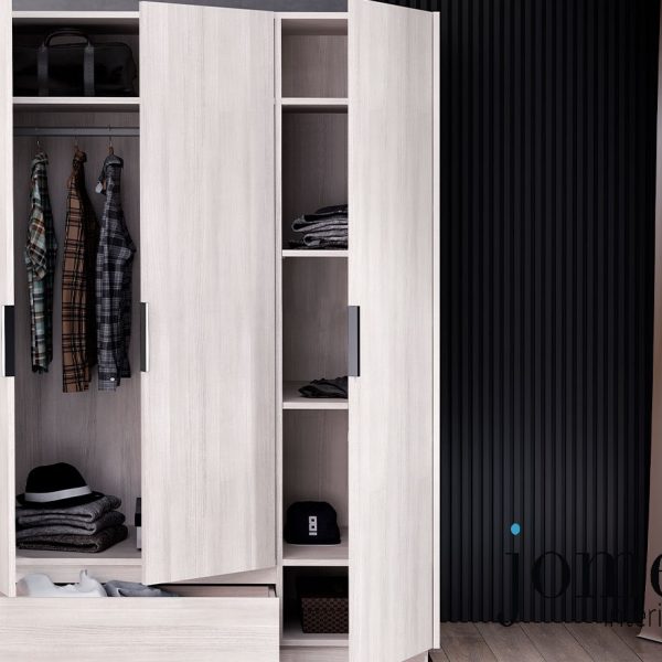 Roupeiro Aqua. Um roupeiro de design moderno e elegante, fabricado em madeira com acabamento melamina, composta por duas ou 3 portas, com um gavetão inferior. A opção de 3 portas contem 1 porta com prateleiras interiores. Vários acabamentos disponíveis.