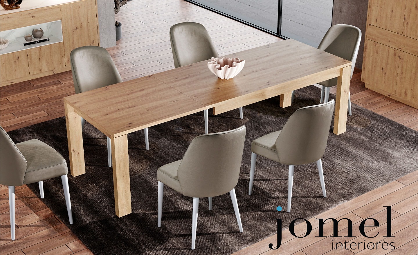 Sala de Jantar Aqua 03. Uma sala de jantar de design moderno e elegante, composta por um aparador de 3 portas e 1 gaveta com nicho e uma mesa de jantar extensível em 70cm com pé de arrasto. Pode adicionar o espelho e cadeiras ao seu conjunto. Várias opções de acabamentos disponíveis.